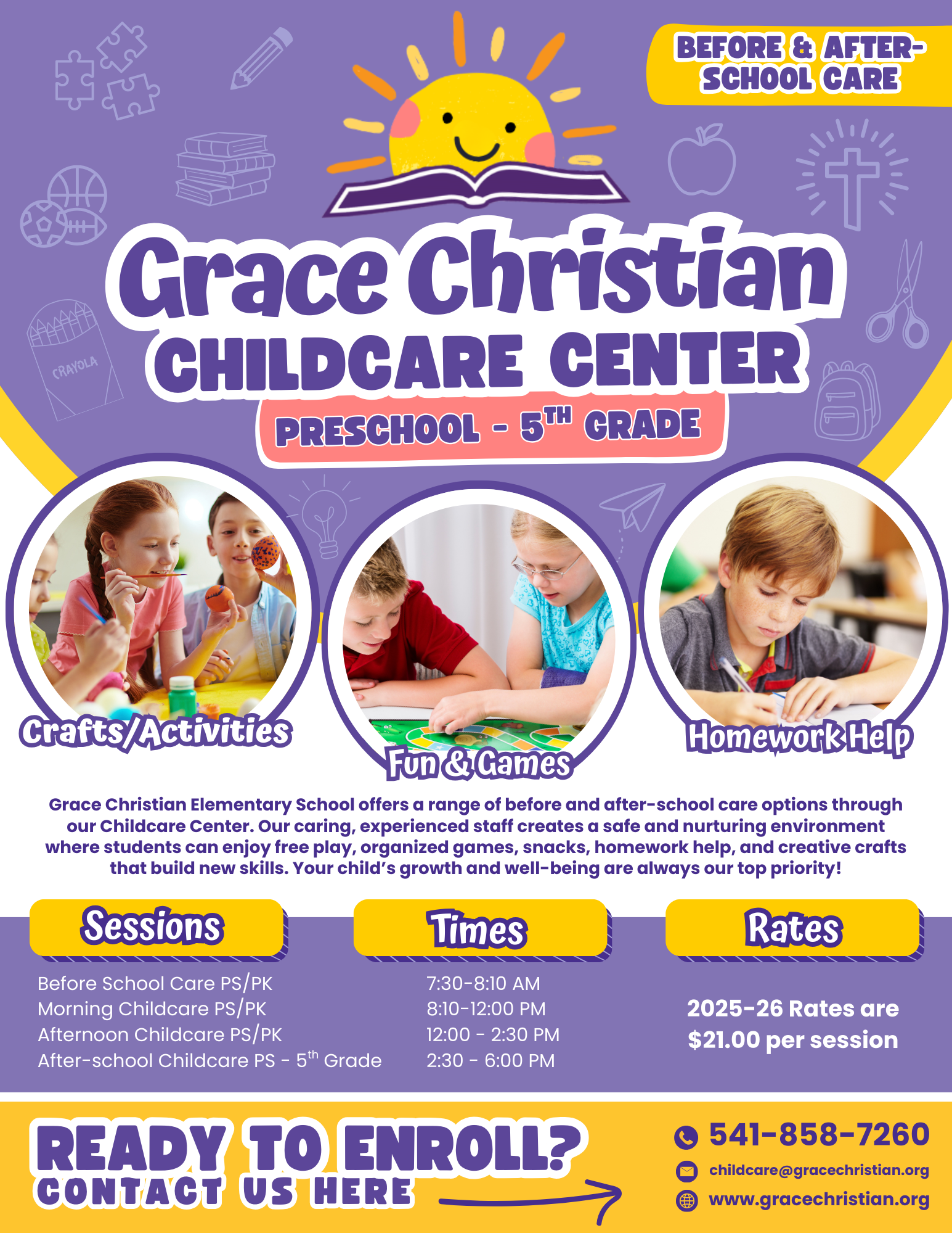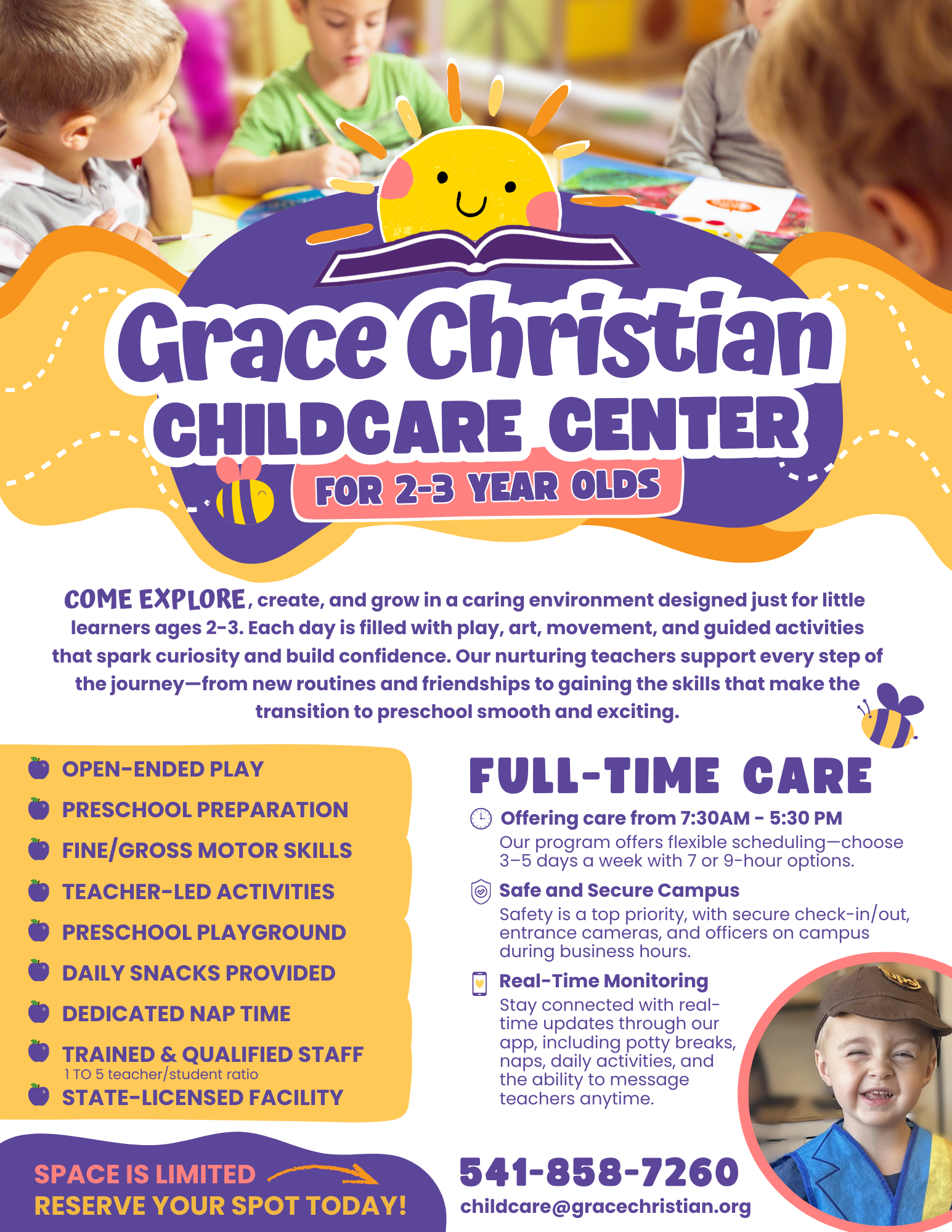 Our childcare center provides a safe, nurturing, Christ-centered environment that enriches your child’s educational experience beyond the school day. We offer a full-time Young Toddler Program for ages 2–3 and before and after-school care for preschool through 5th grade, with children grouped by age to support healthy development.